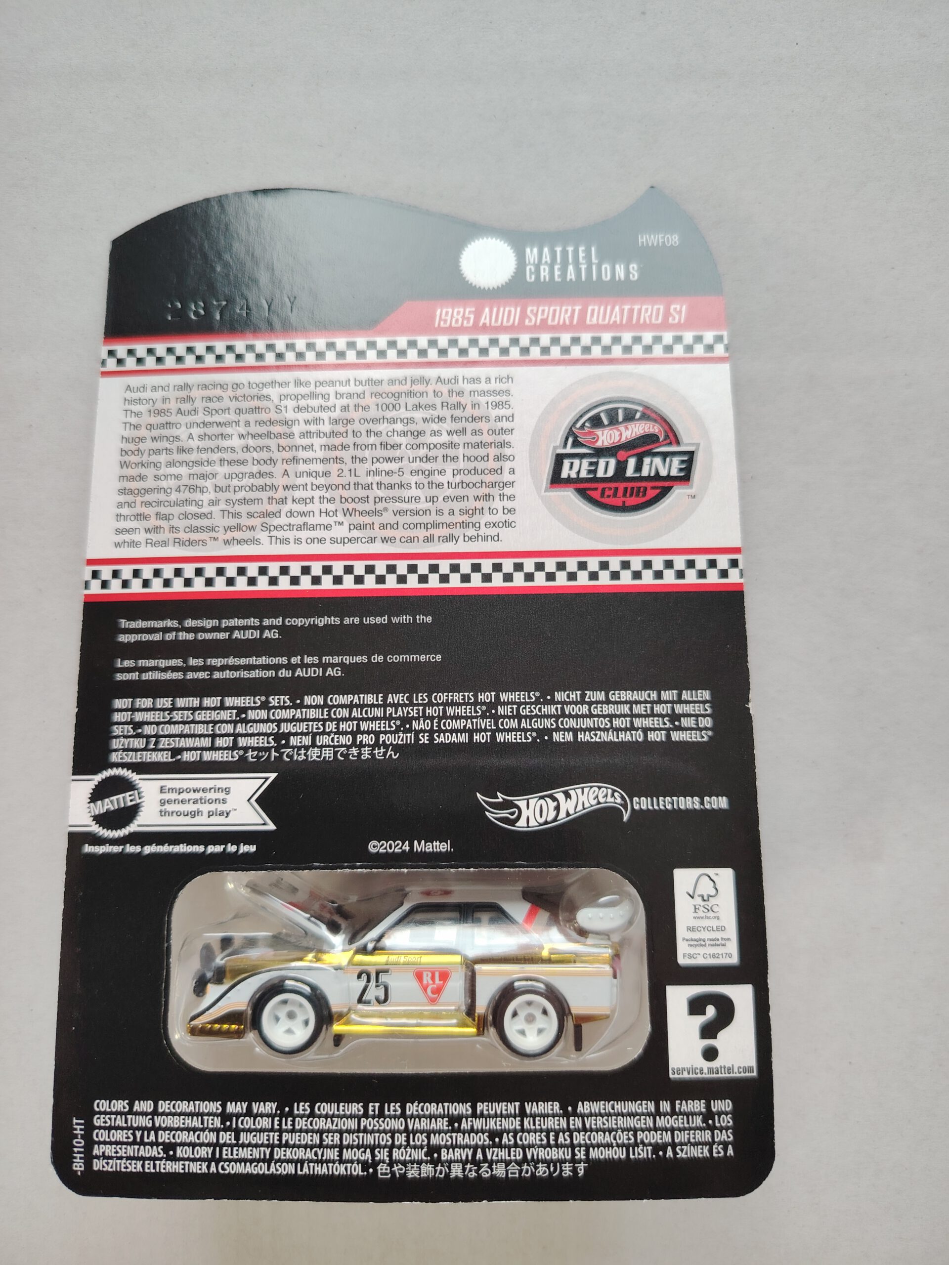 Dekor: Rallye-Dekor mit gelben Streifen, glänzend weißem Spoiler und Motordetails